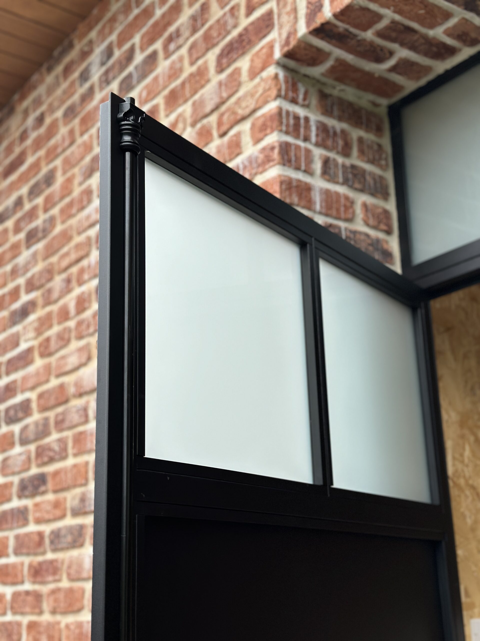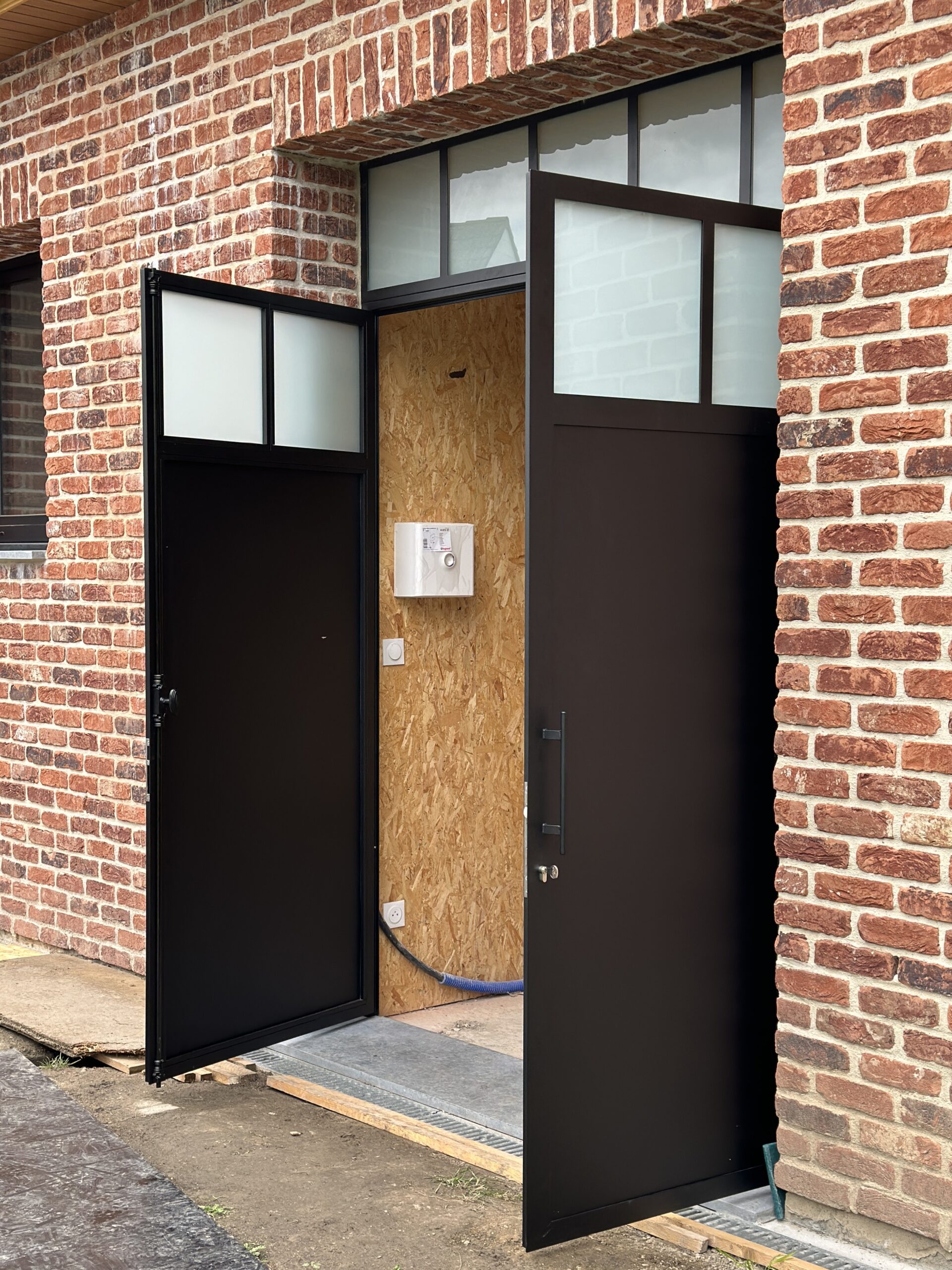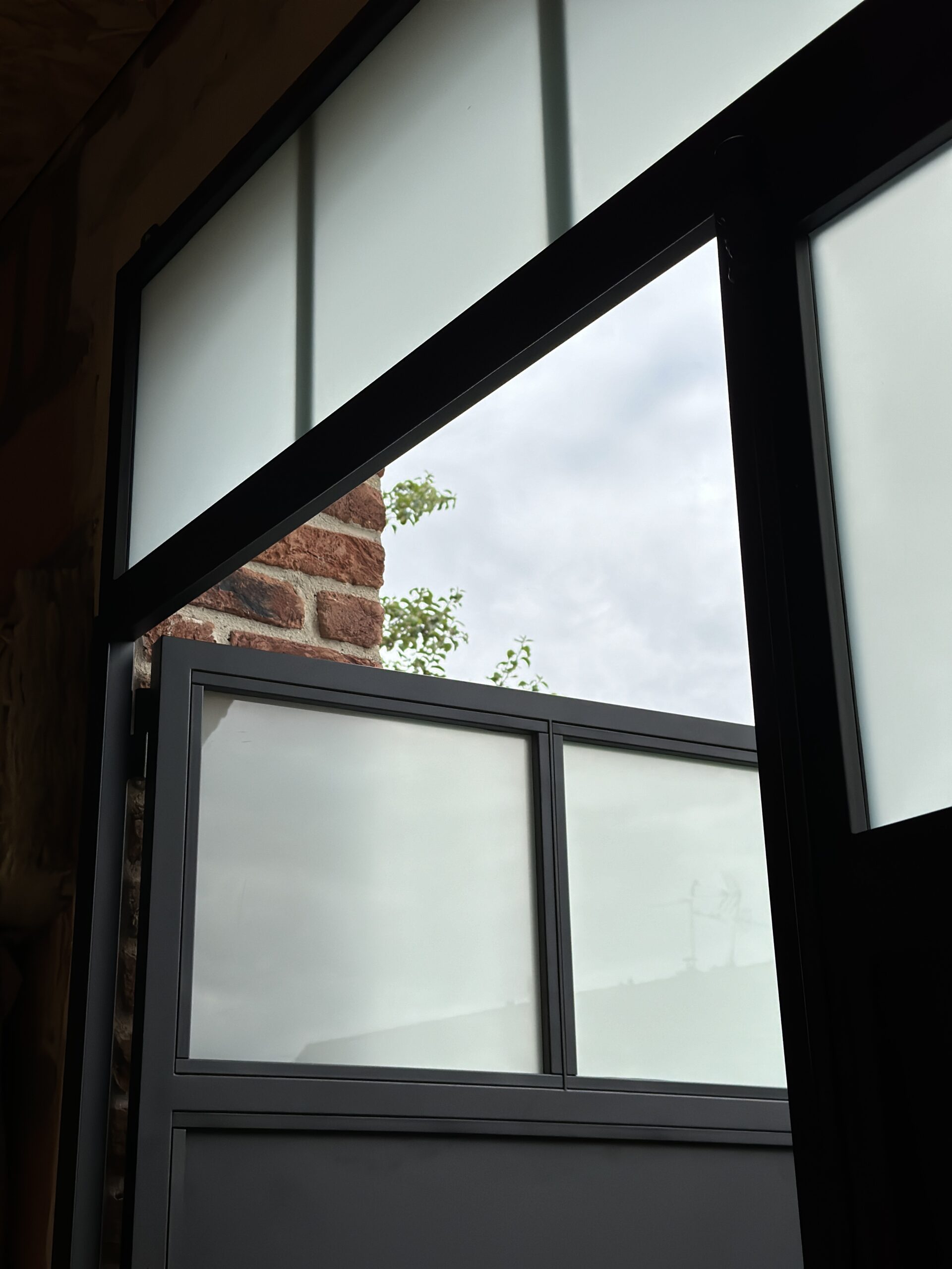 Imposte fixe vitré. Vitrage opale blanc. Remplissage en tôle. Serrure à rouleau et condamnation à clé. Crémone en fonte pour condamnation du semi-fixe. Brosses en bas de porte.