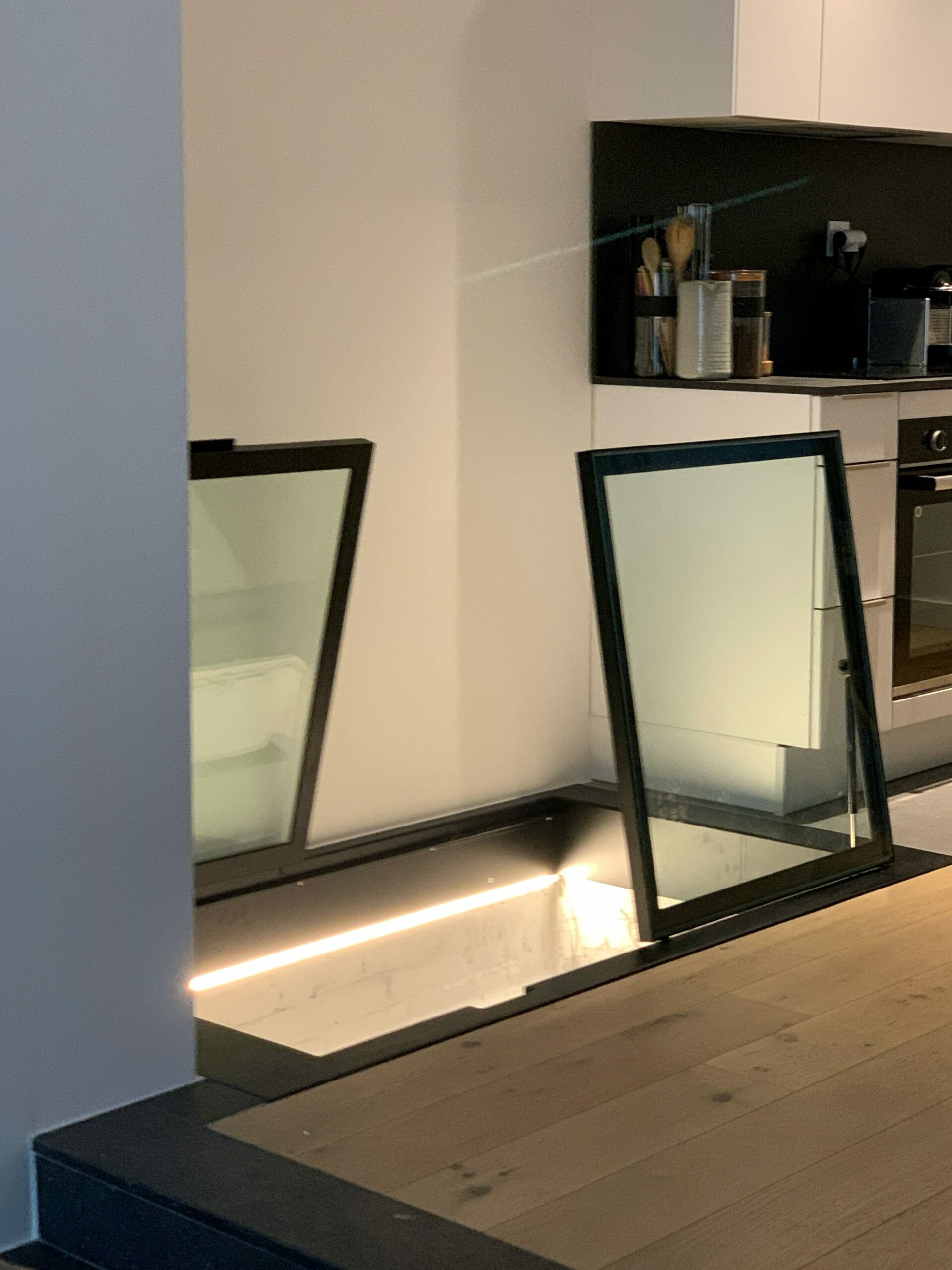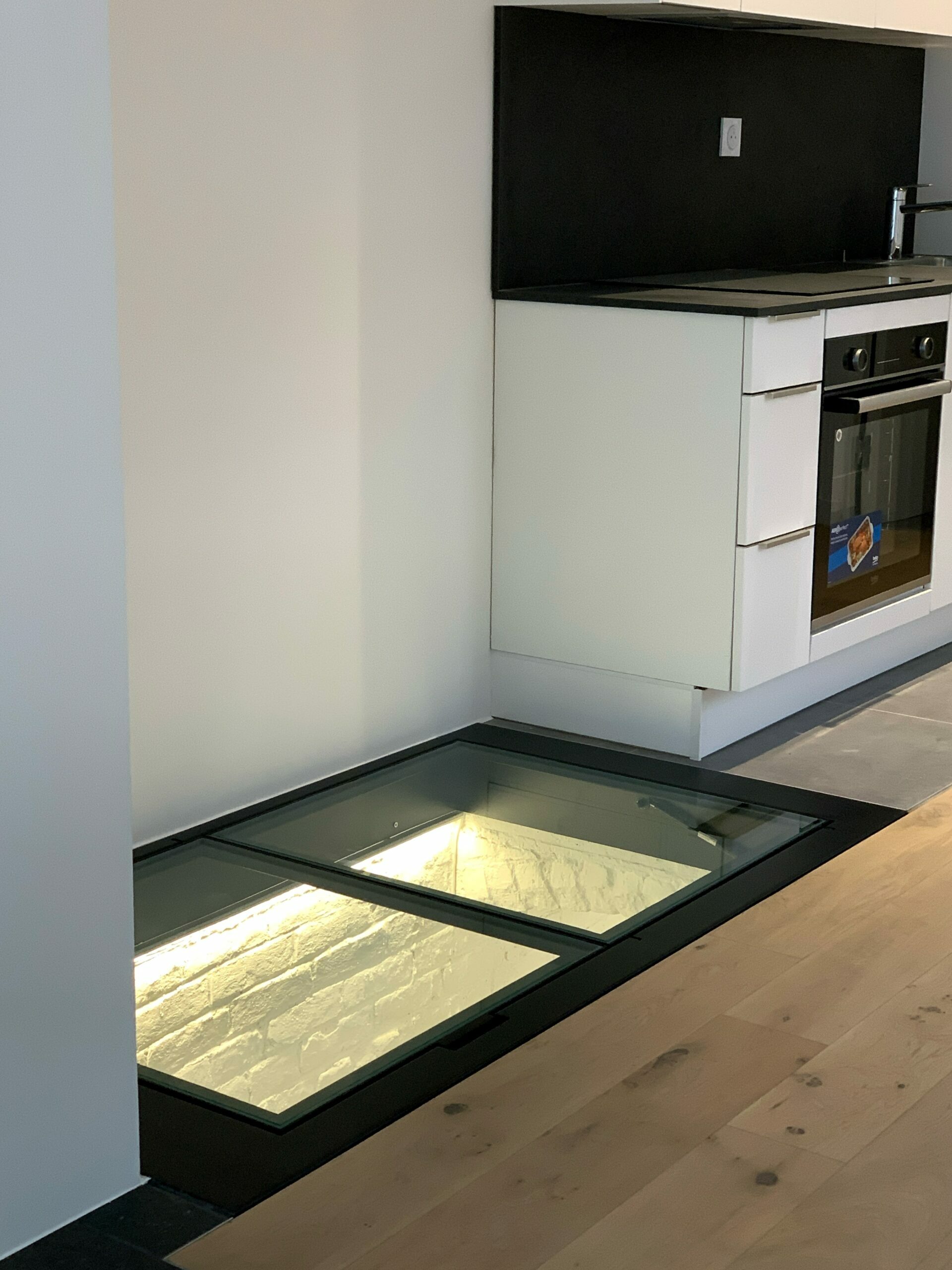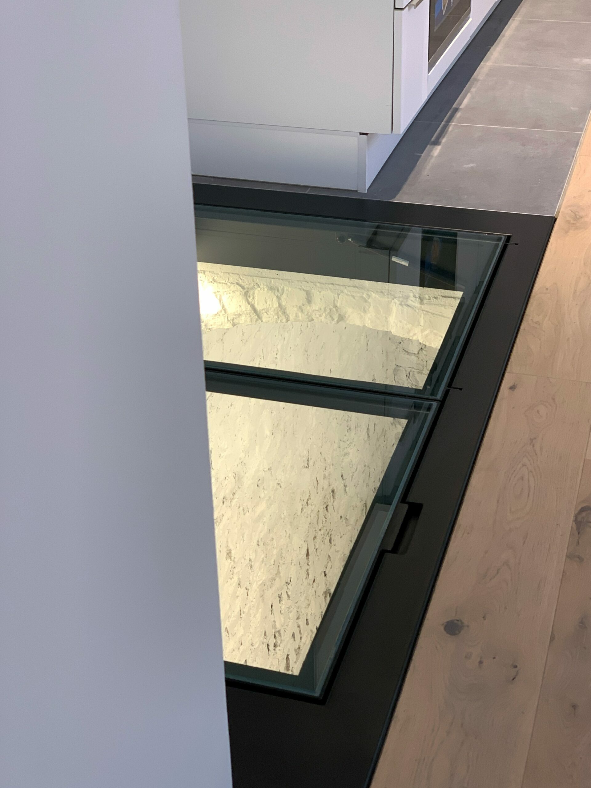 Poignée encastrée affleurant au sol. Aide à l’ouverture et fermeture par vérin hydraulique